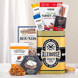 This metal snack tin is filled with savory snacks like Think jerky, made with sustainably-raised 100% grass-fed beef and 100% natural turkey with no added hormones or antibiotics. Sriracha honey turkey jerky, beef and turkey sticks, honey roasted peanuts, sesame crackers, smoked Gouda cheese spread and Riffs Smokehouse Bacon On The Go cooked bacon make up this protein-packed gift.