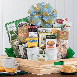 Start their day off right with this wooden breakfast tray brimming with strawberry preserves, scone mix, cookies, lemon cakes, French roast coffee, English tea, hot cocoa mix, madeleine cake, chocolate brownie and two handy mugs to complete this morning pick-me-up.