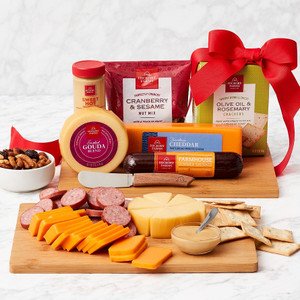 Give the gift of an effortlessly gourmet charcuterie spread! This meat and cheese gift set features everything they’ll need to build the perfect board. It includes Farmhouse Summer Sausage, Farmhouse Cheddar, Smoked Gouda Blend, Sweet Hot Mustard, and Olive Oil & Rosemary Crackers to create delicious flavor combinations paired perfectly with the sweet and salty flavor of the Cranberry & Sesame Nut Mix. And the included cutting board and cheese spreader make serving and enjoying so much easier.