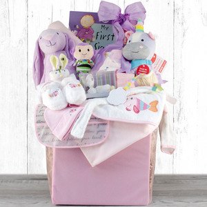 Help baby make her grand entrance into the world with a mesh and fabric folding storage cube filled with loads of luxuries and necessities!