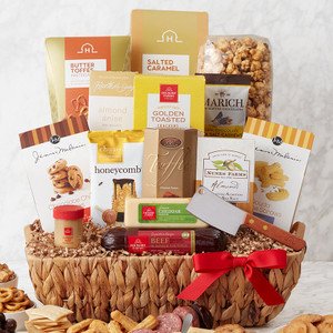 Give the gift of a perfect date night charcuterie spread! This gift box lets them create a savory bite with Signature Beef Summer Sausage, Jalapeño Cheddar Blend, Sweet Hot Mustard, and Golden Toasted Crackers. Gouda cheese straws and Nunes Farms Sea Salt Almonds make the perfect addition to the meat and cheese spread. Then, there are plenty of treats and snacks to share like Marich Milk Chocolate Sea Salt Cashews, Butter Toffee Pretzels, Chocolate Caramel Drizzled with Sea Salt Popcorn, Chuao Honeycomb Chocolate Bar, French Truffles, Chocolate Chip Cookies, Salted Caramel Cookies, and Biscotti di Suzy Almond Anise. The included cheese cleaver make serving and enjoying easy! Send this gift to anyone who loves to treat themselves to sweet and savory snacks.