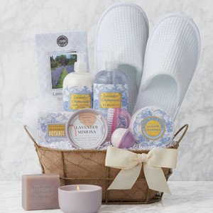 This basket is loaded with everything for someone who loves lavender and good vibes. The spa gift includes Lavender Chamomile hand lotion, hand soap, body butter, and bar soap. The lavender sachets and a lavender mimosa candle add ambiance. A small loofah and bath bombs will make a tub soak a total joy. And with waffle slippers and a nail brush to keep those toes happy, there isn't a basket loaded with more simple pleasures. This season, give the gift of a spa day–no appointments required.