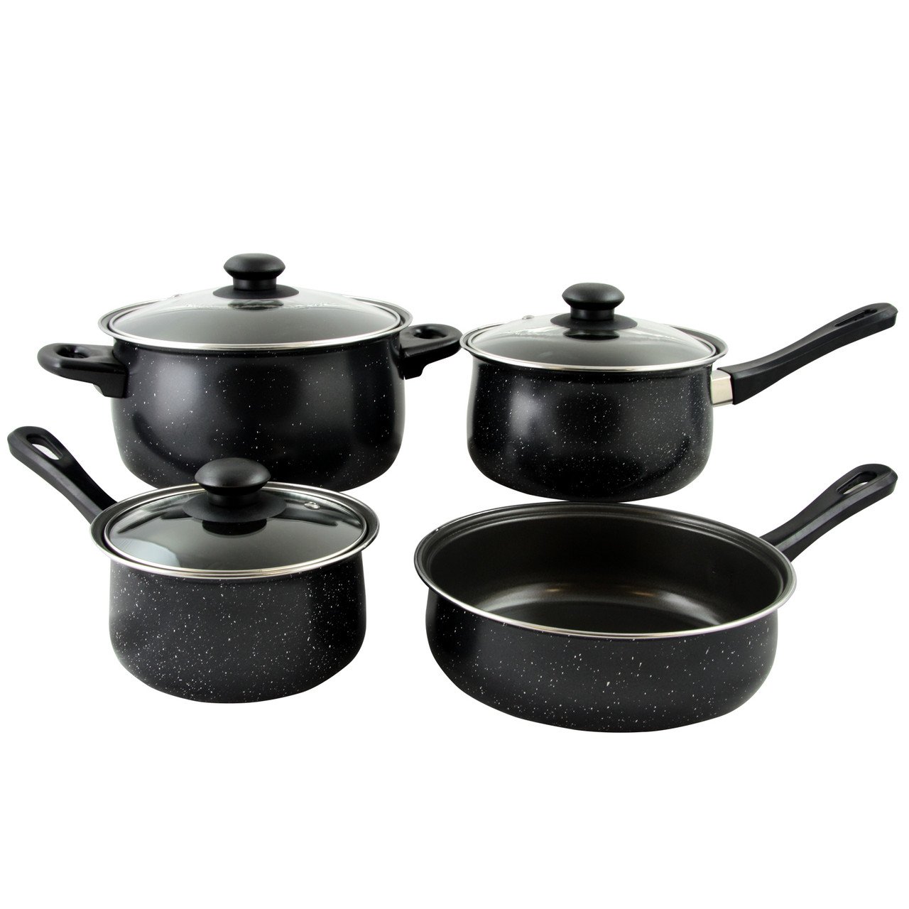 The Gibson Home Casselman 7 Piece Cookware set features an enamel look with a black finish. The set features a non-stick interior. This set is carbon steel constructed, has Bakelite heat-resistant handles, glass lids and a unique speckle exterior finish. Hand wash only.