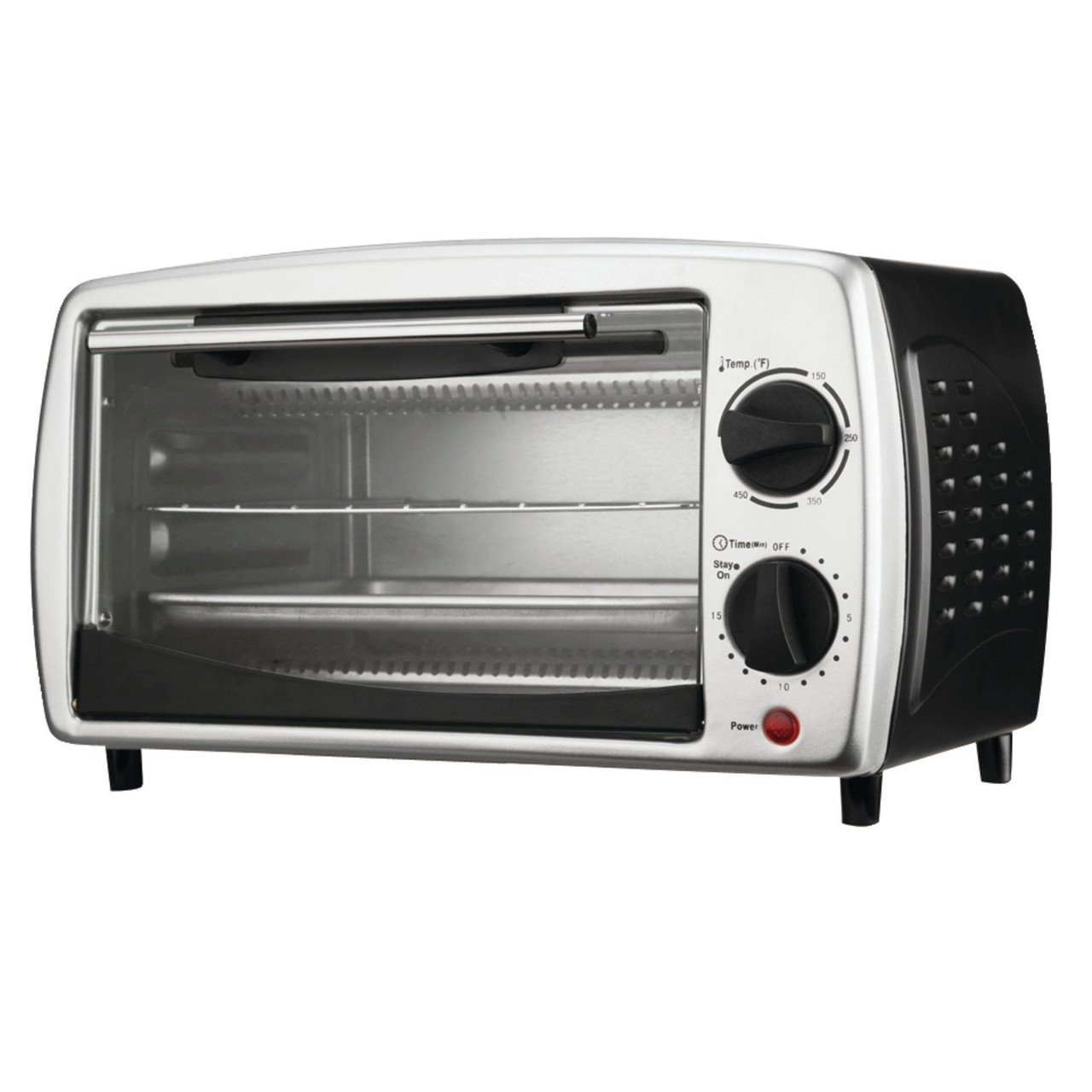 The powerful 800w Brentwood Stainless Steel 4 Slice Toaster Oven can toast, broil and bake an array of foods. Adjustable temperature ranges 50 to 450 degrees. Choose between the 15 minute timer with auto shut off and stay on functions. Two rack positions and two heating elements insure even toasting. Convenient crumb tray. Includes food tray and wire rack.