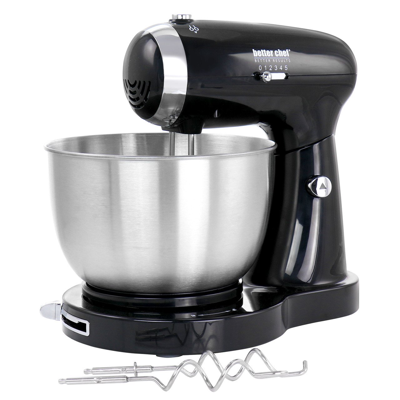 Mix, Blend, Beat and Kneed all with the Better Chef 350 Watt MegaMix Stand Mixer in Black. The 350 Watt motor and 5 speed settings cover most of your everyday mixing needs. Ideal for quickly and easily mixing up your favorite cookie doughs, mashed potatoes, bread doughs and so much more. Includes interchangeable beaters and dough hooks and aa locking stainless steel mixing bowl. Dishwasher safe accessories for easy clean up and compact for convenient storage.