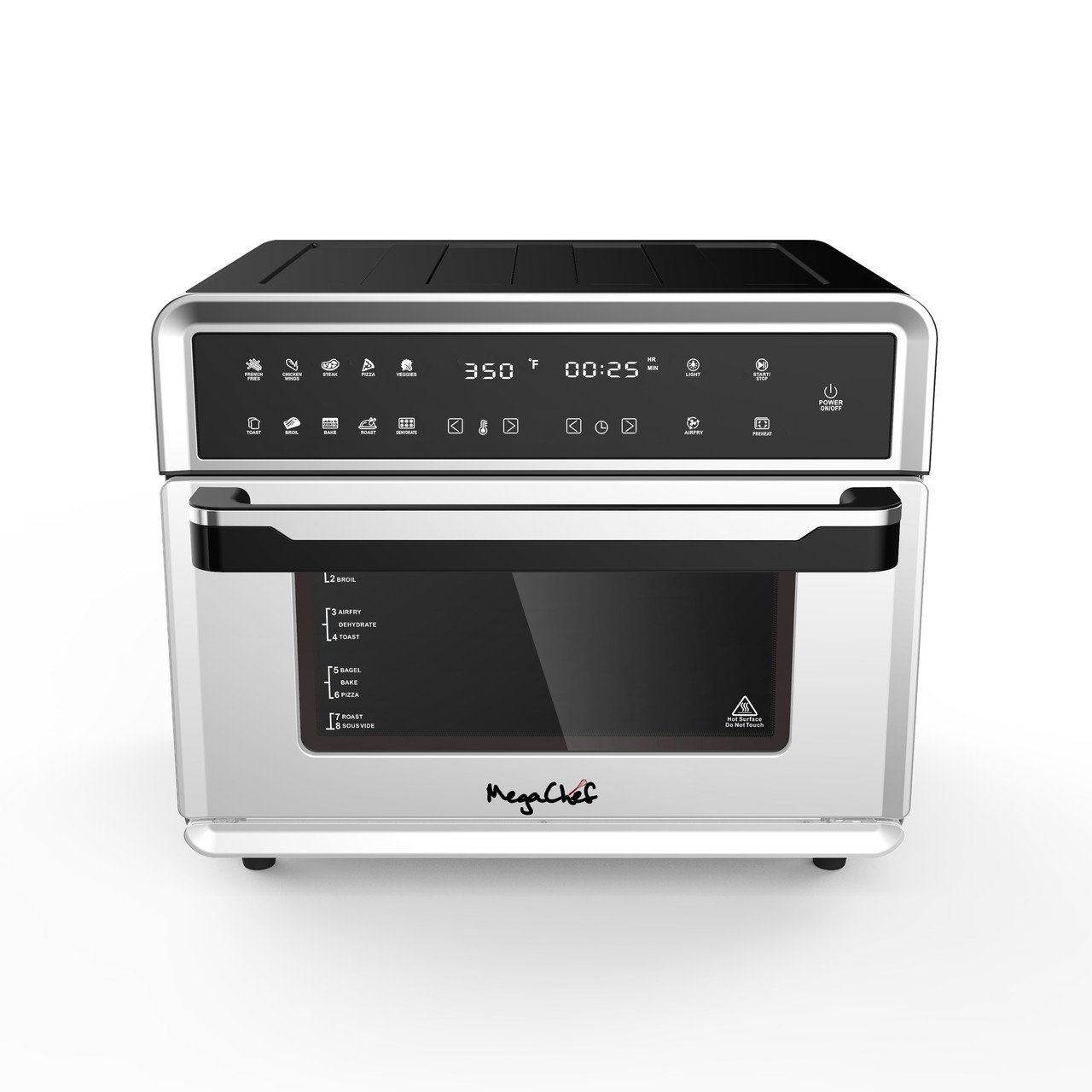 Extra versatile Digital Touch Display and 10 preset functions: French Fries, Chicken Wings, Steak, Pizza, Vegetables, Toast, Broil, Bake, Roast and Dehydrate.