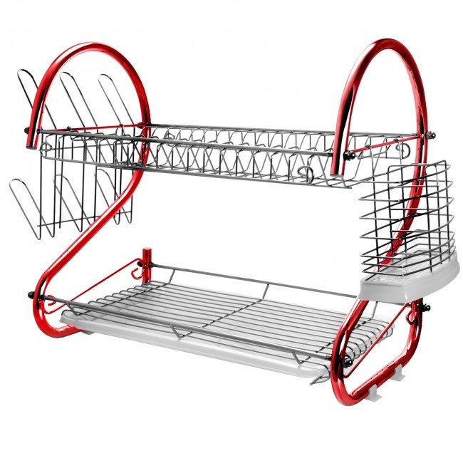 Simplify the task of drying your dishes with the MegaChef 16 Inch Two Shelf Iron Wire Dish Rack in Red! This dish rack features a utensil holder, plastic draining tray, two tiers, slots for plates and space for cups and bowls. The drying rack also has a plastic drain tray that collects water from the dishes while drying. This dish and utensil rack is a handy addition to your kitchen and adds a pop of color to the room!