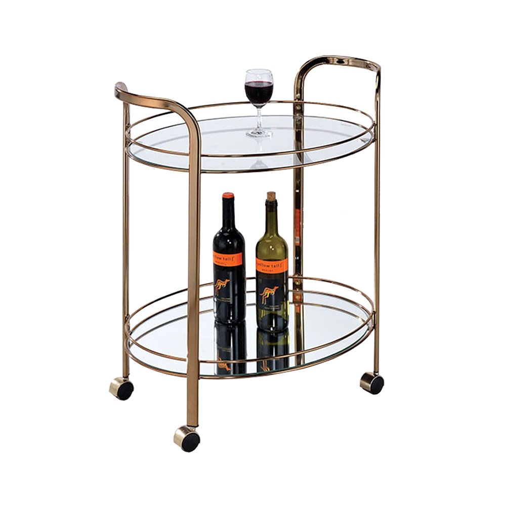Serve your guests snacks and beverages easily and conveniently with the help of this amazing oval shaped serving cart. Constructed from metal in a gold finish, it features two 5mm tempered glass shelves and raised handles for access. It is supported by caster wheels, providing easy mobility.