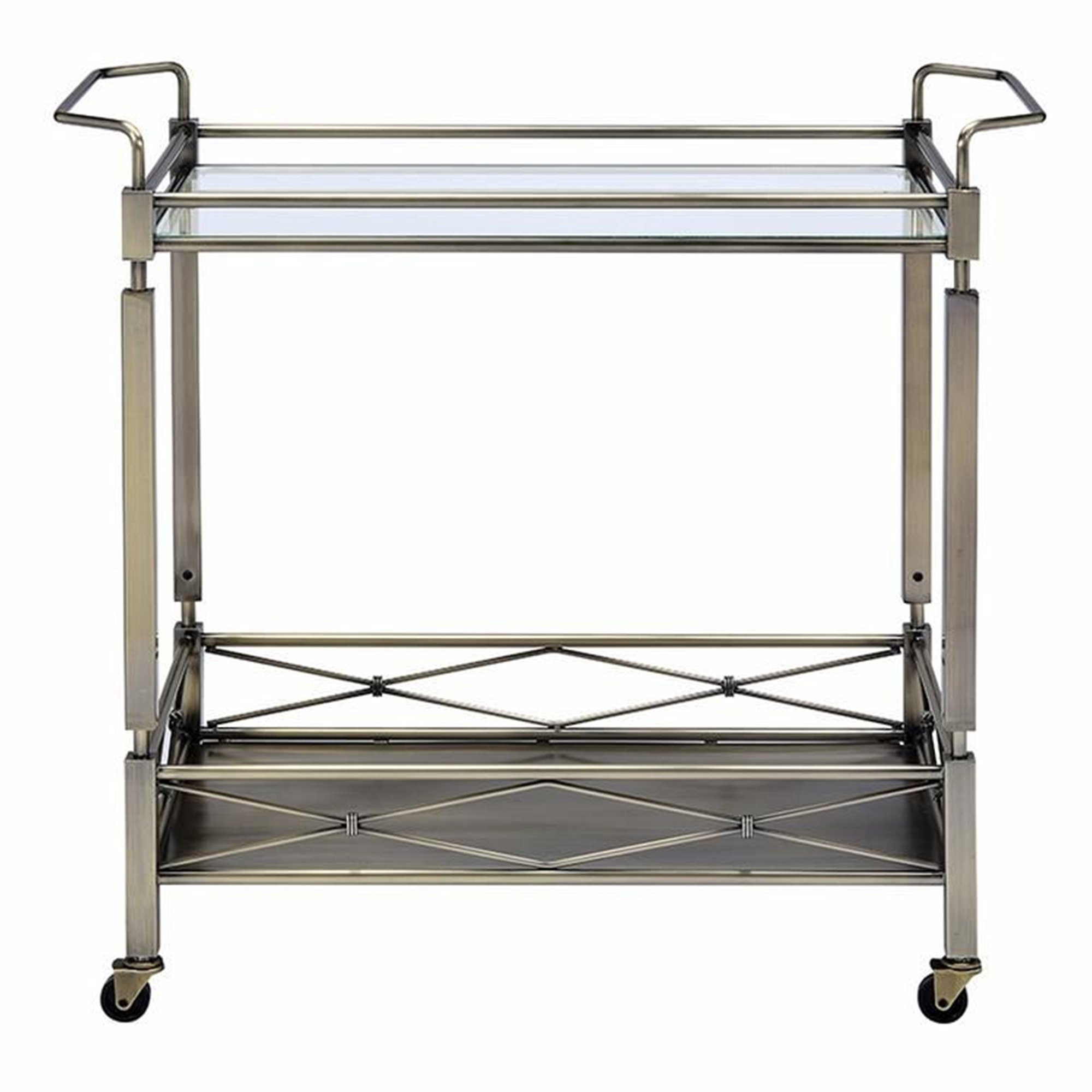 Elegantly designed with modern appeal, this cart will be a perfect addition to your living room, dining room or bar area for serving drinks and food in sleek style. With antique gold finish metal frame, this cart features two tiered glass shelves with a side rails for secured placement of glasses and bottles. The castor wheels and curved side handles provide easy portability and mobility while utilizing the cart to its efficient usage.