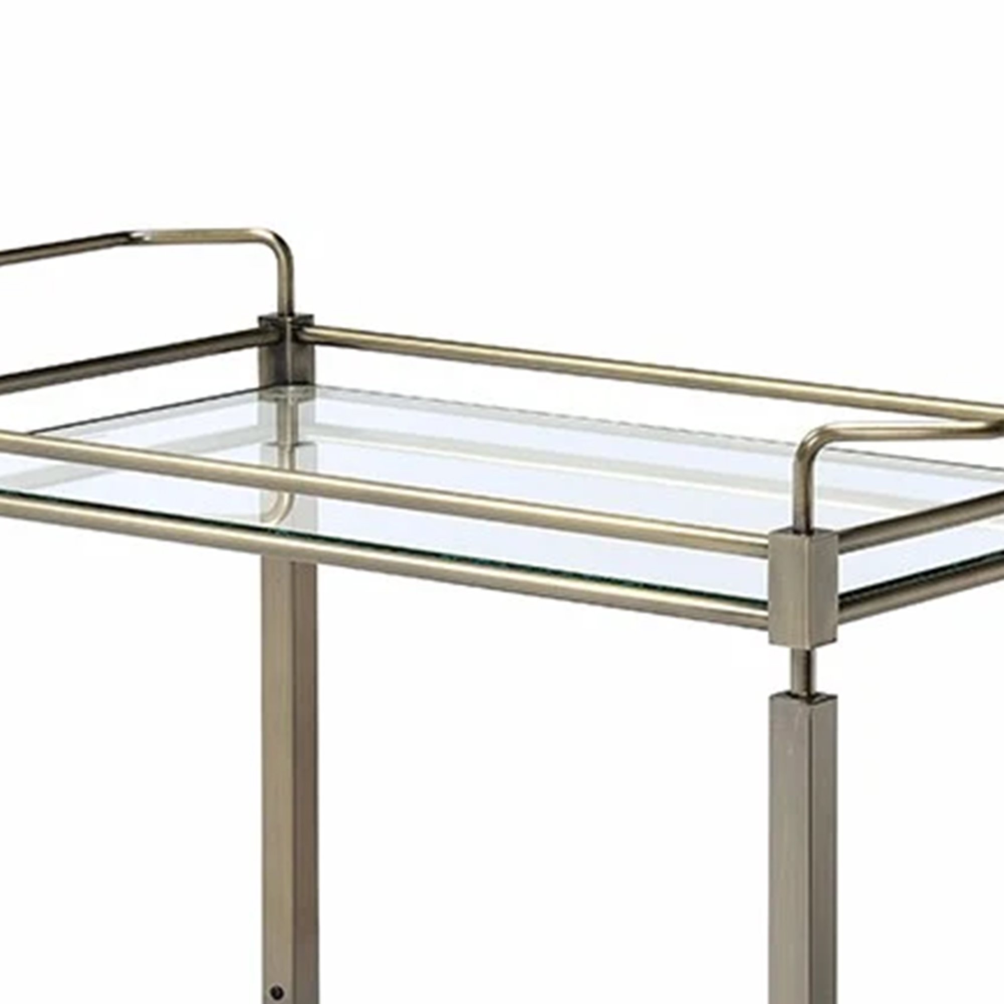 Two Tiered Metal Serving Cart with Glass Shelves and Side Rails, Antique Gold Two Tiered Metal Serving Cart with Glass Shelves and Side Rails, Antique Gold Two Tiered Metal Serving Cart with Glass Shelves and Side Rails, Antique Gold Two Tiered Metal Serving Cart with Glass Shelves and Side Rails, Antique Gold Two Tiered Metal Serving Cart with Glass Shelves and Side Rails, Antique Gold