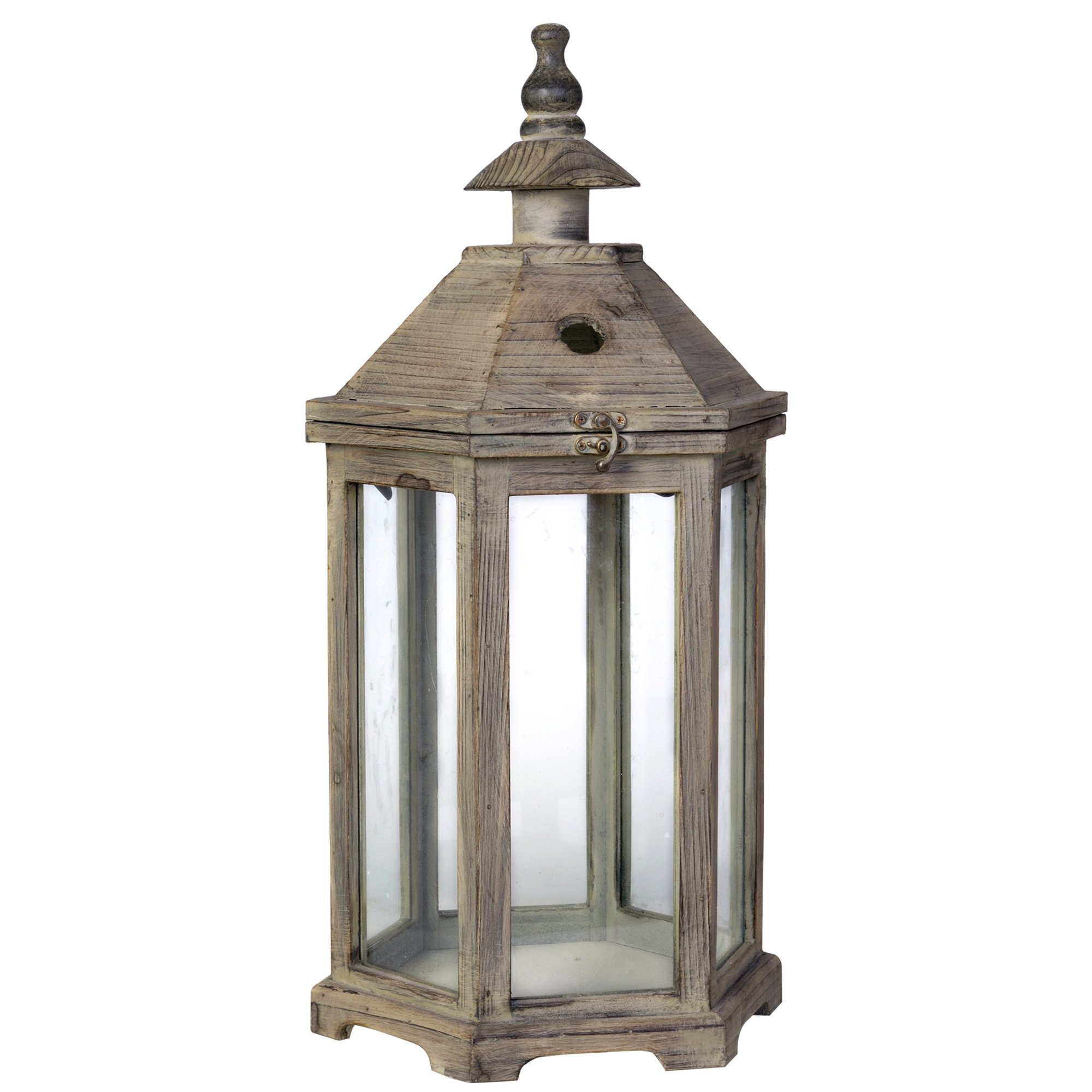 Light up your summer or winter nights with this Set of Two traditional Lanterns that will bring a soft glow to your porch, patio, or poolside. The wood framing of these lanterns takes on the shape of a tall gazebo or airy temple and they are finished in a weathered texture to give the illusion of age. Just place you favorite candle inside these Lanterns and create an inviting atmosphere for your special indoor or outdoor area.