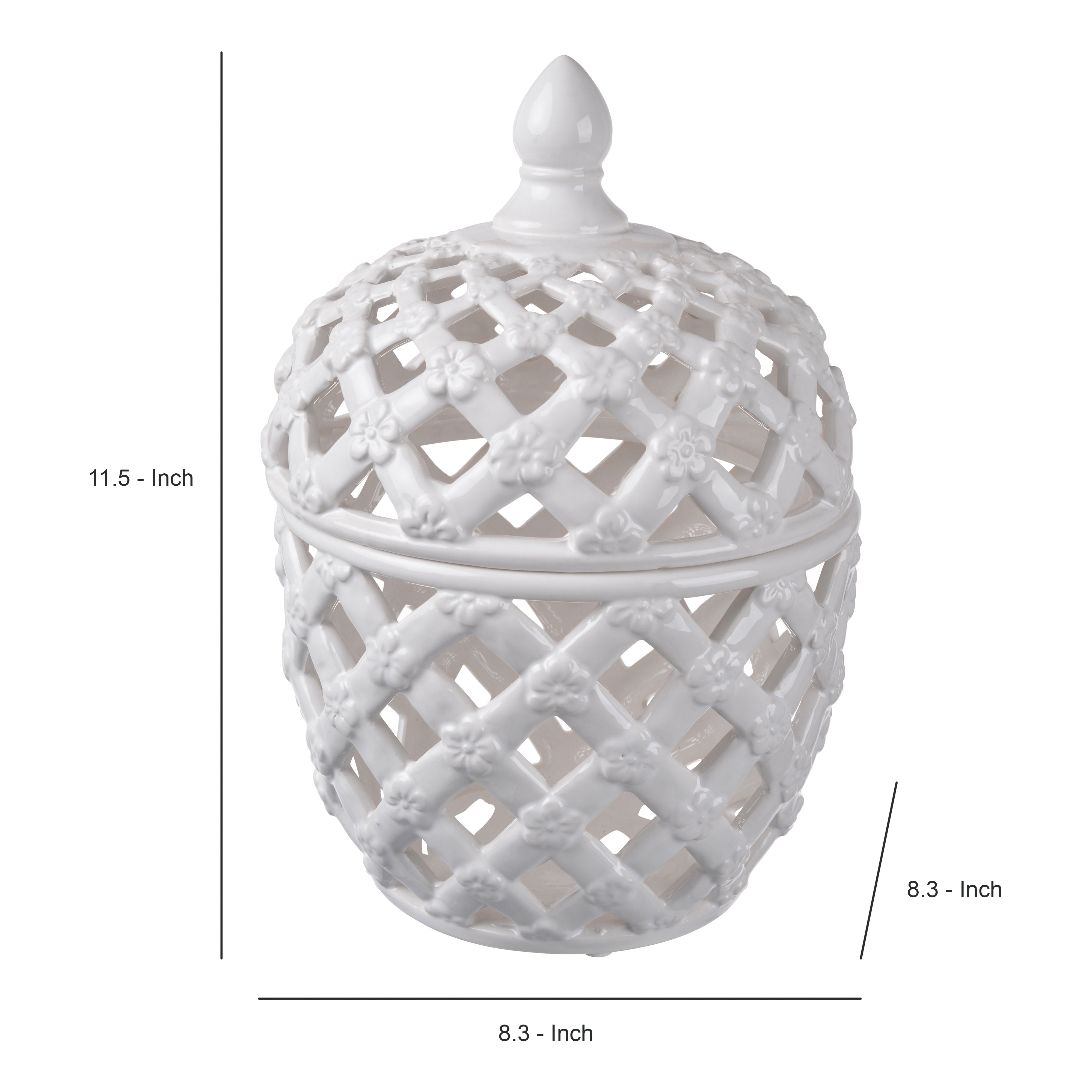 This elegantly beautiful lidded jar is made of ceramic and is ideal for multiple display purposes at in your living space. Featuring with a white color finish, this large sized jar has cut out texture, floral motif design and lid at the top. Keep it on any table top, mantel or shelf to give it an attractive display. This can also used to keep colorful decorative balls and pebbles inside to give classic look.