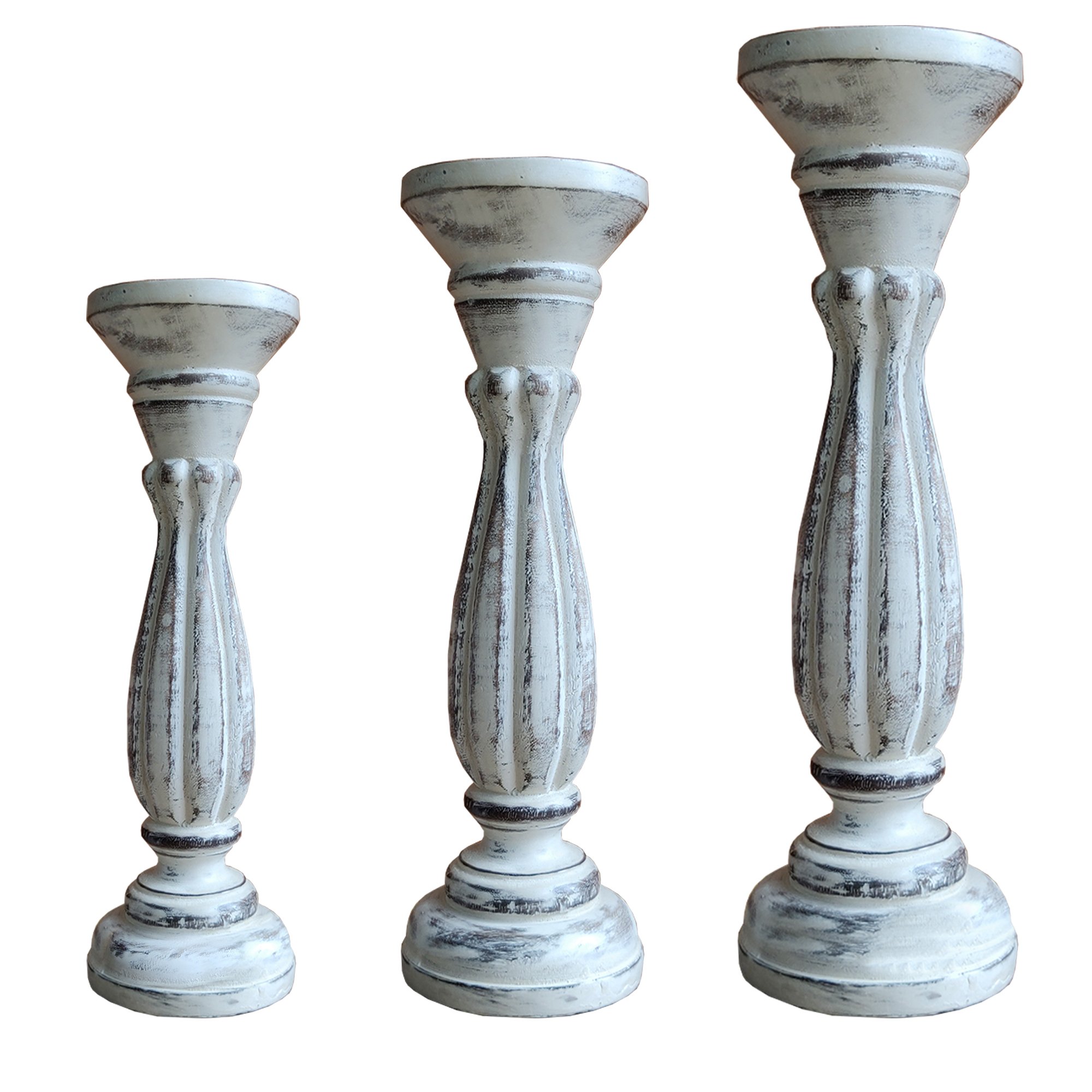 Handmade Wooden Candle Holder with Pillar Base Support, Distressed White, Set of 3