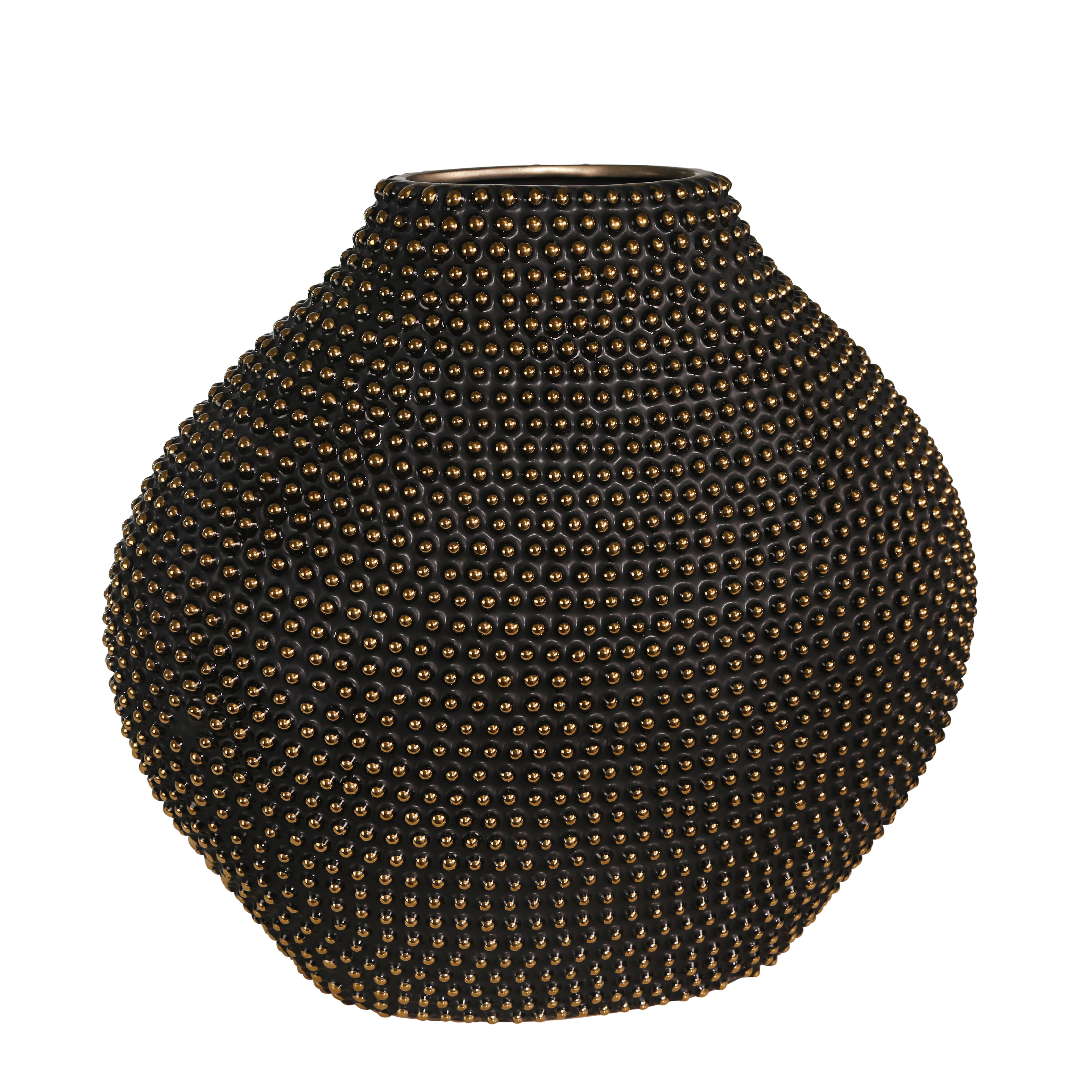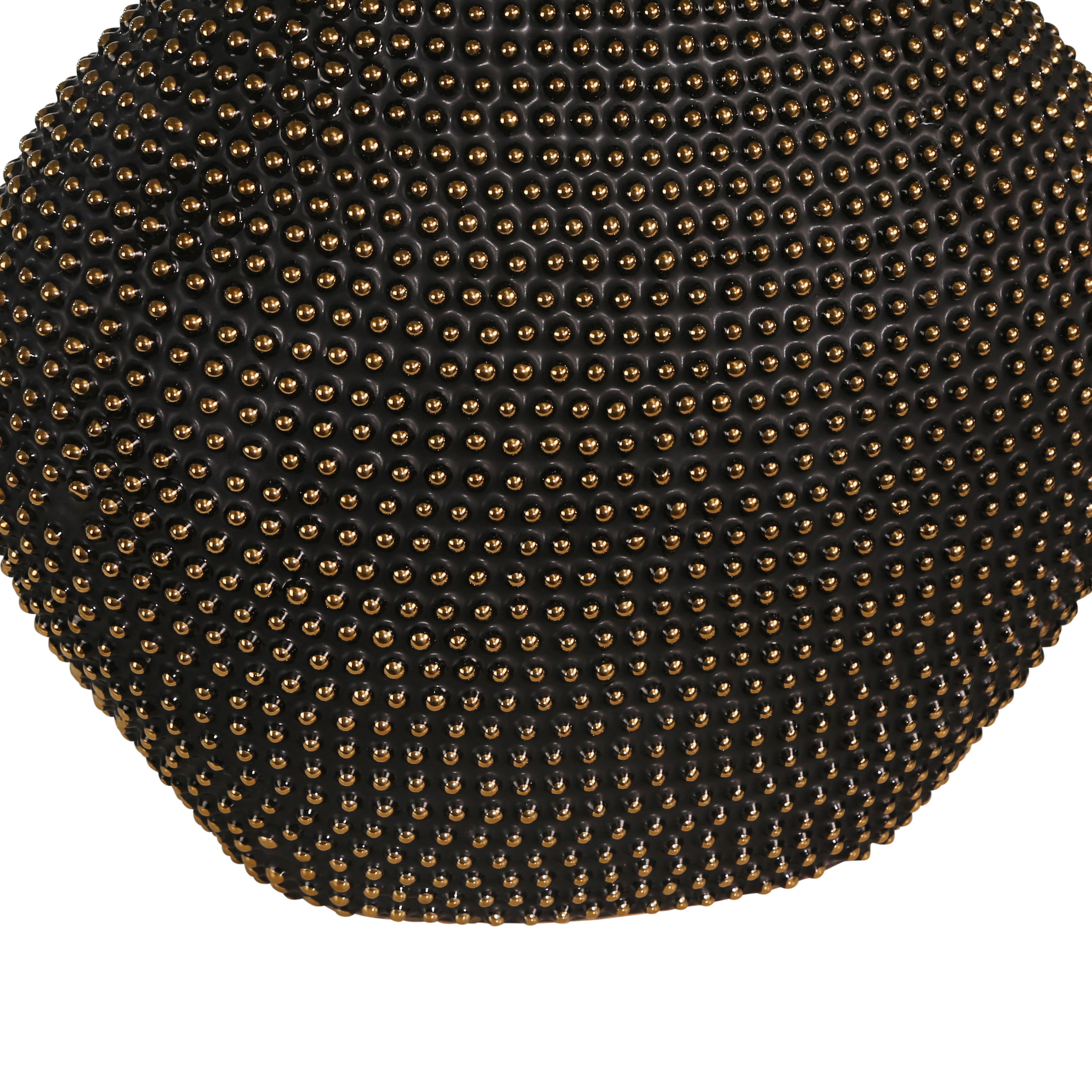 Bellied Honeycomb Ceramic Vase with Beaded Details, Black and Gold