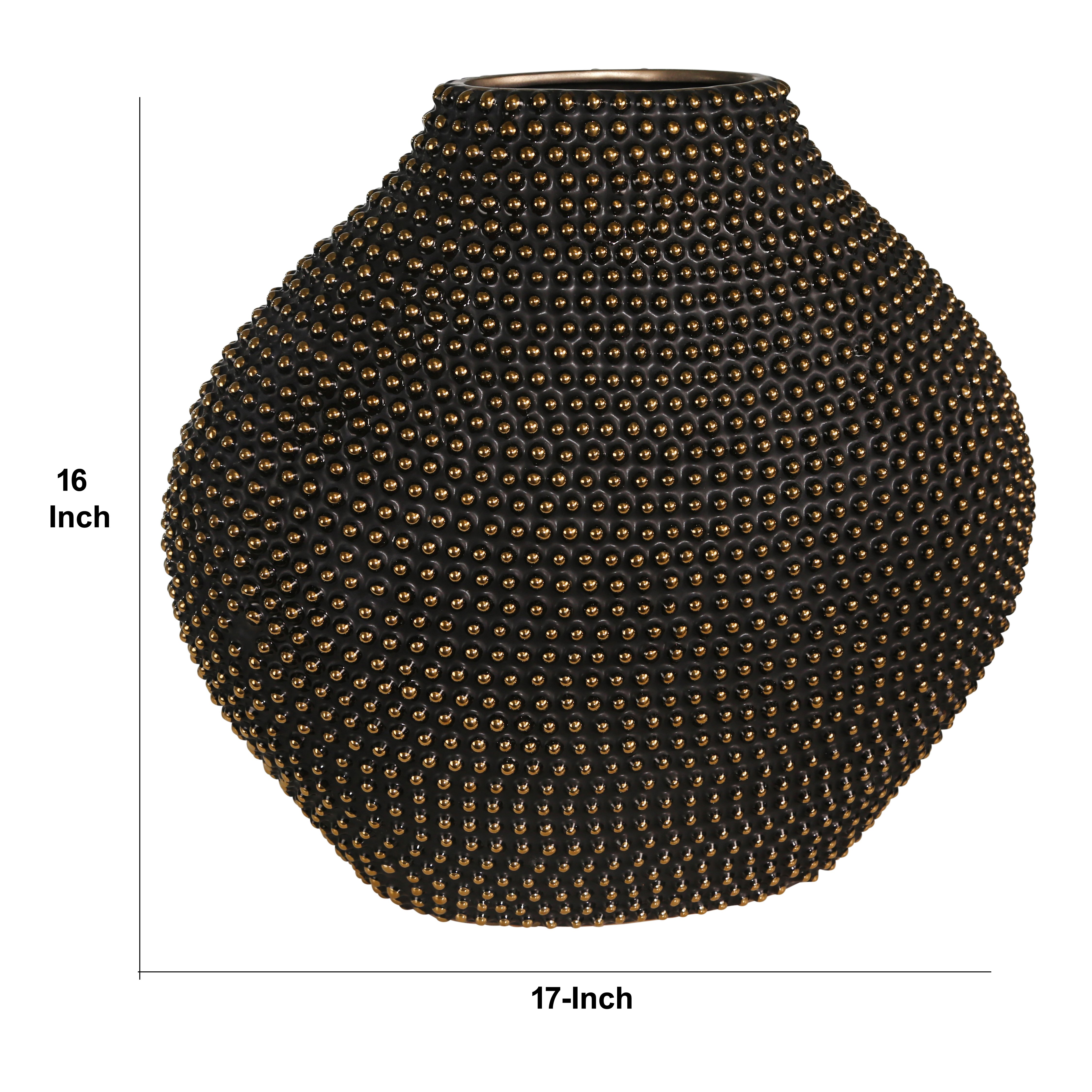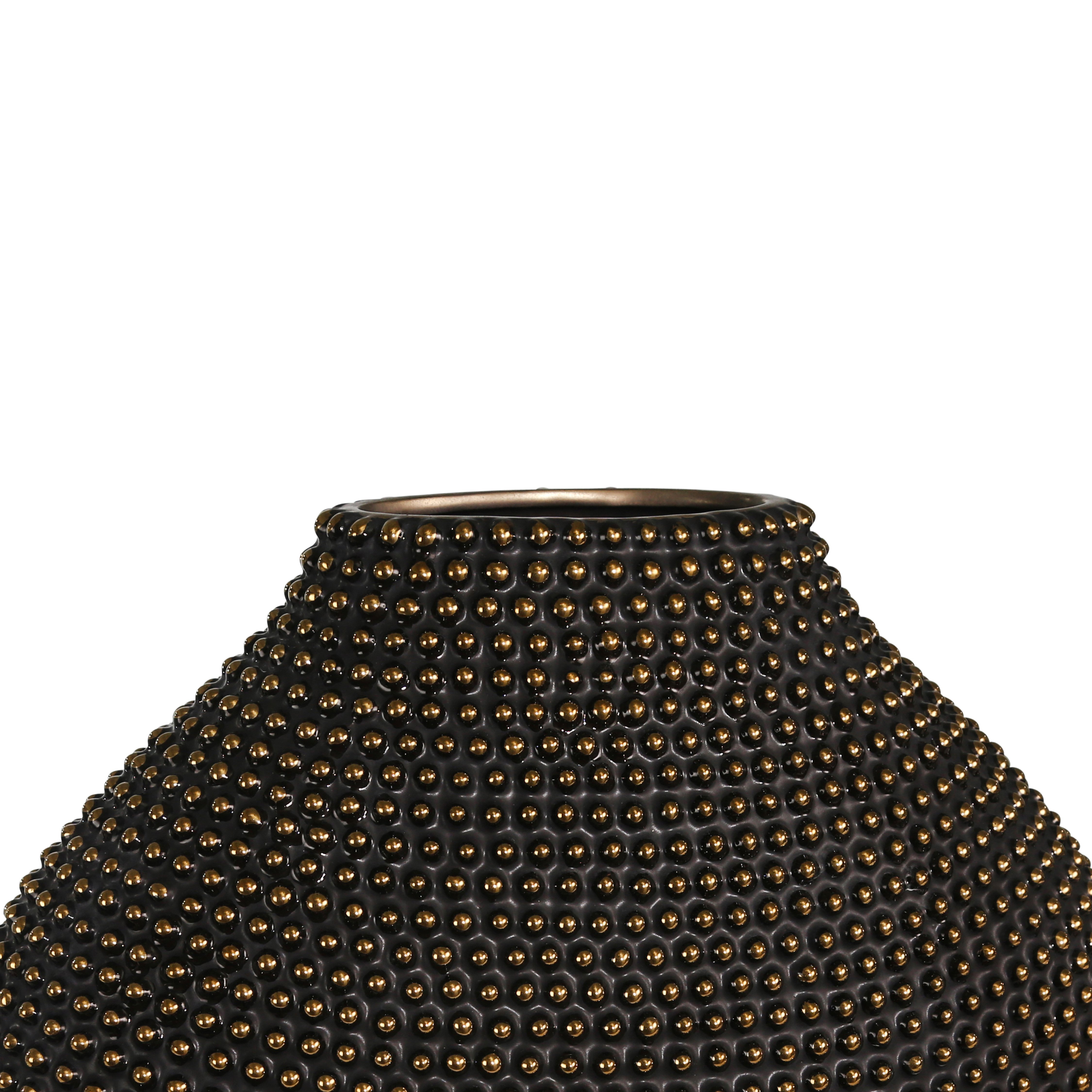 Amalgamate your decor setting by incorporating this contemporary style vase, featuring beaded details and comes in pot bellied shape. Crafted from ceramic, it is accented in the hues of gold and black. Place your favorite flower in it and keep it atop your end table or console table and create an aromatic atmosphere. It will serve the best of its purpose.