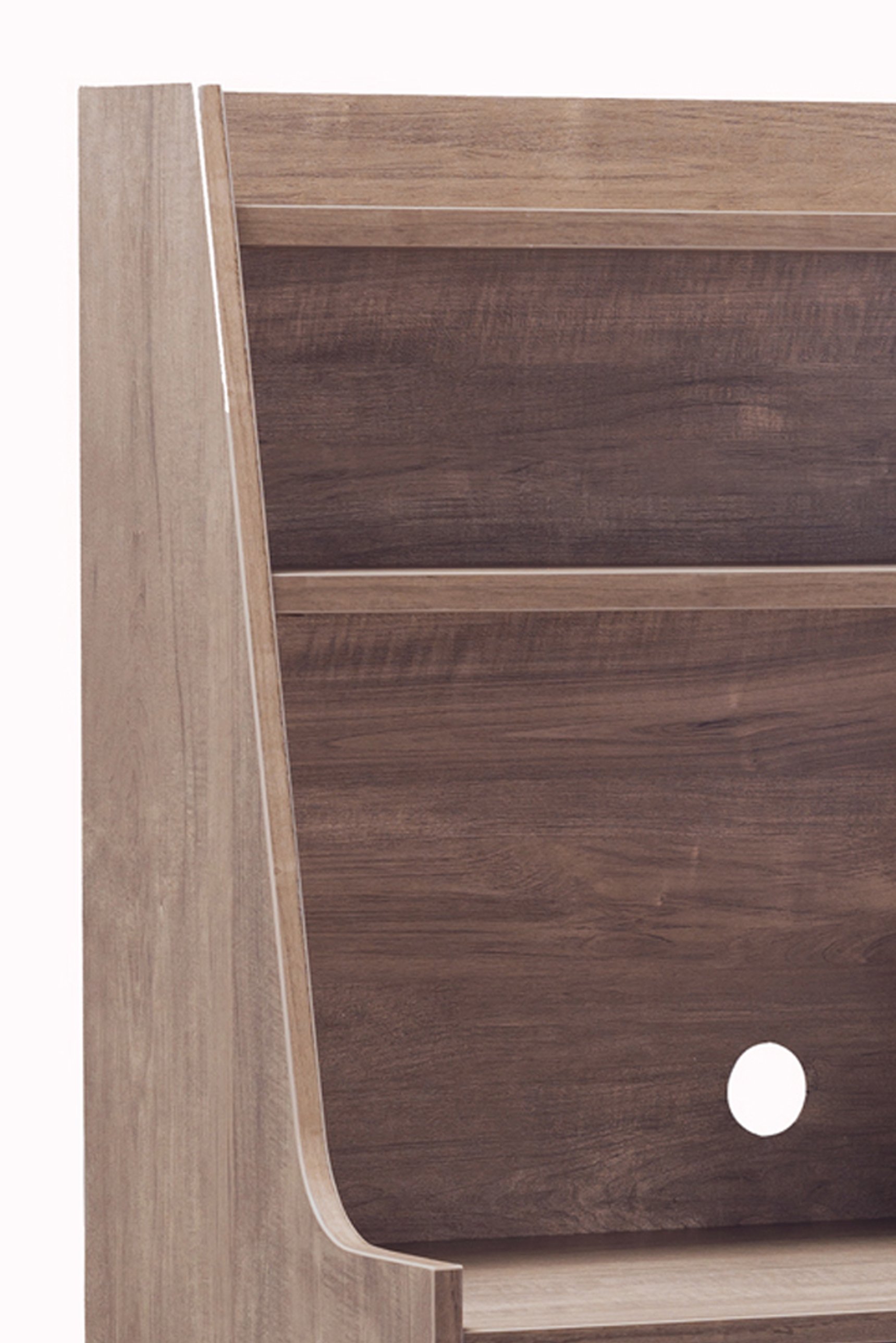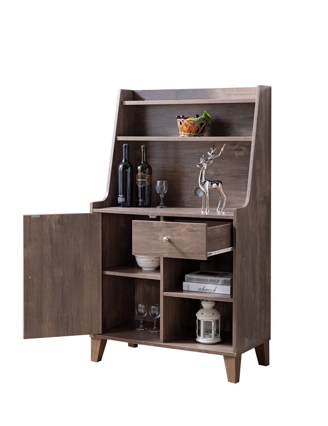 Enhance the aesthetics of your dining area with the setting up of this bakers cabinet. Constructed sturdily from wood and MDF in hazelnut finish, it features 2 open bottom shelves and 2 top storage shelves, 1 drawer and a door cabinet that opens up to reveal 2 spacious compartments inside. Supported on tapered legs, the bakers cabinet offers an organized place for your dining necessities and can also be used for decorative display.