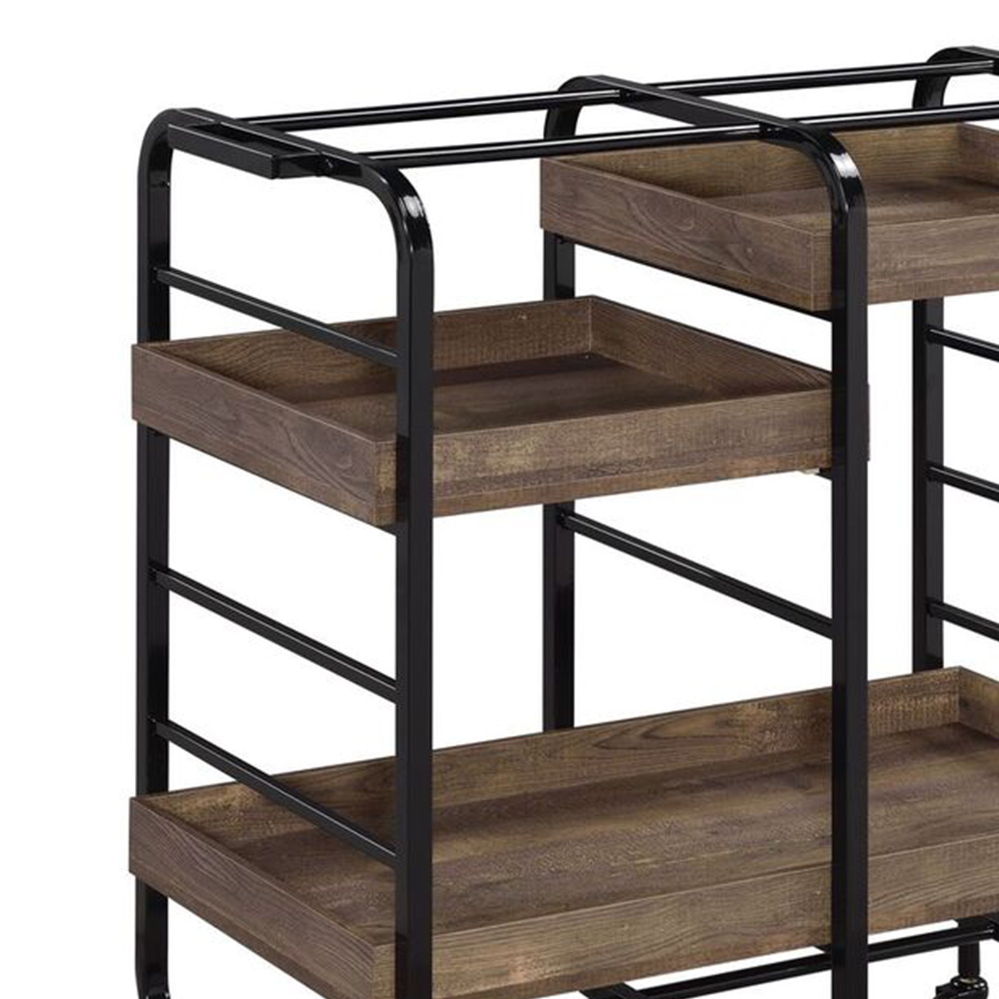 Metal Frame Serving Cart with 3 Open Storage and Casters, Brown and Black