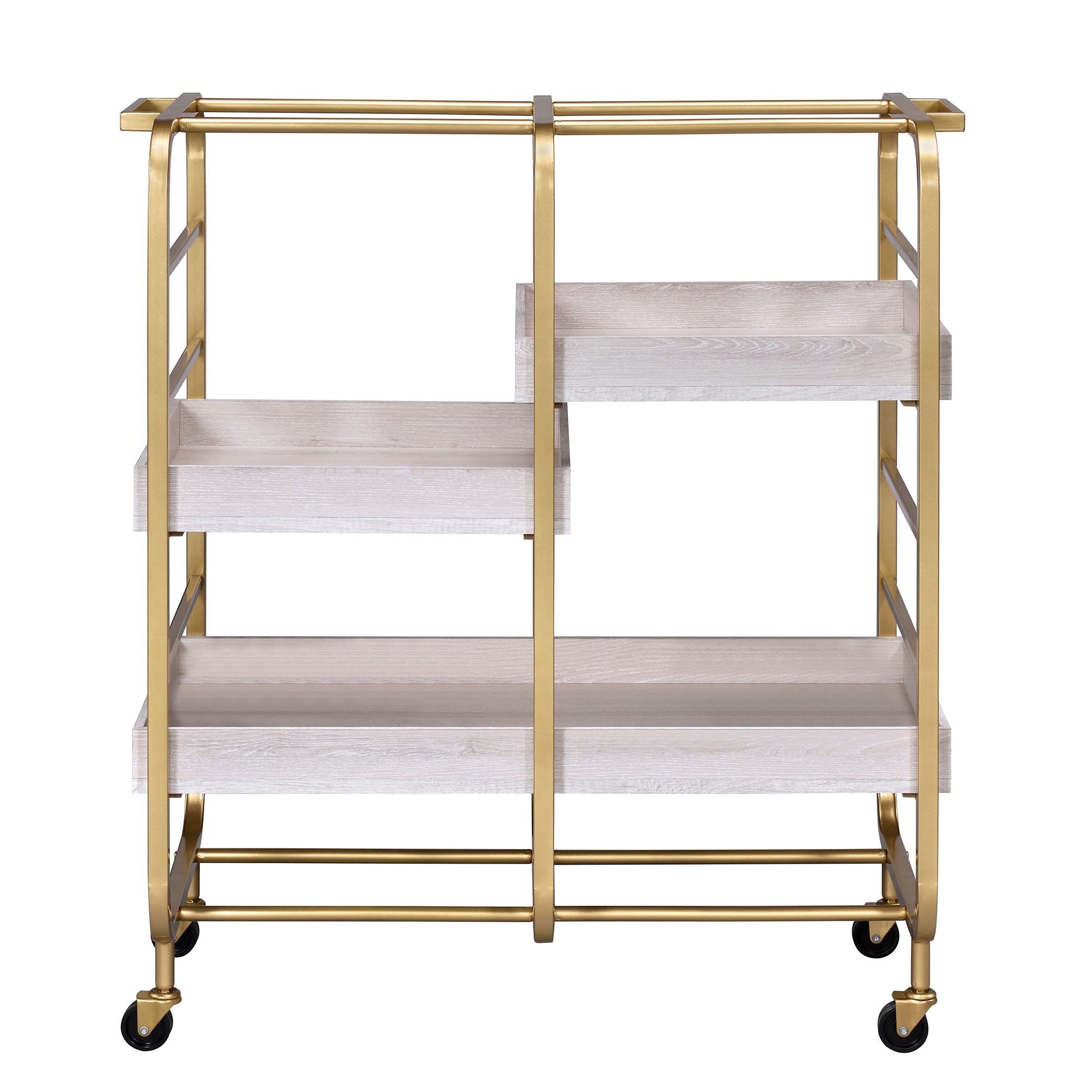 Incorporate a perfect display and storage option to your home with the inclusion of this versatile Serving Cart. Featuring an open metal frame in a gold finish, this cart comes with three washed white finish, adjustable storage compartments that offer ample space for showcasing decor items as well as for the utility storage.