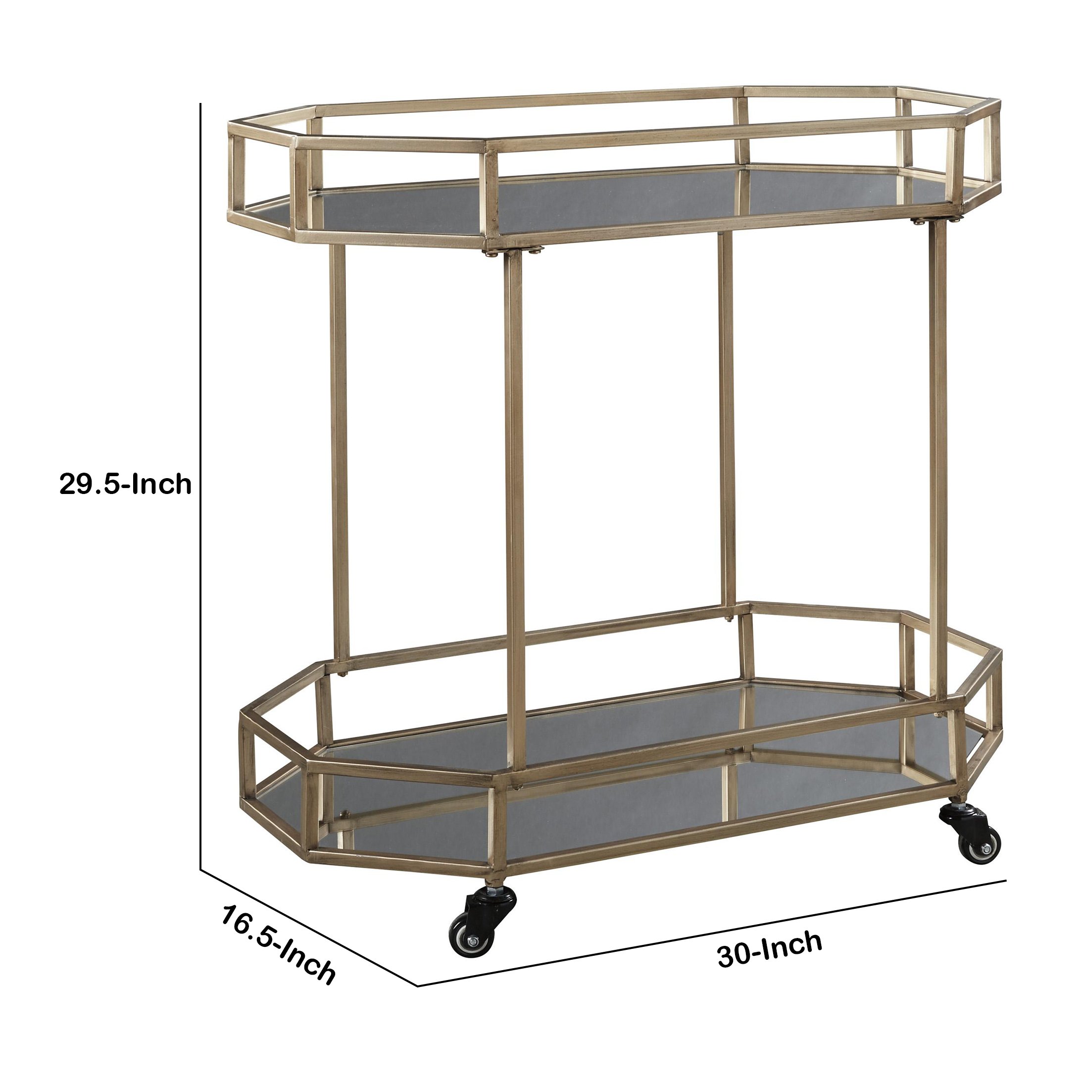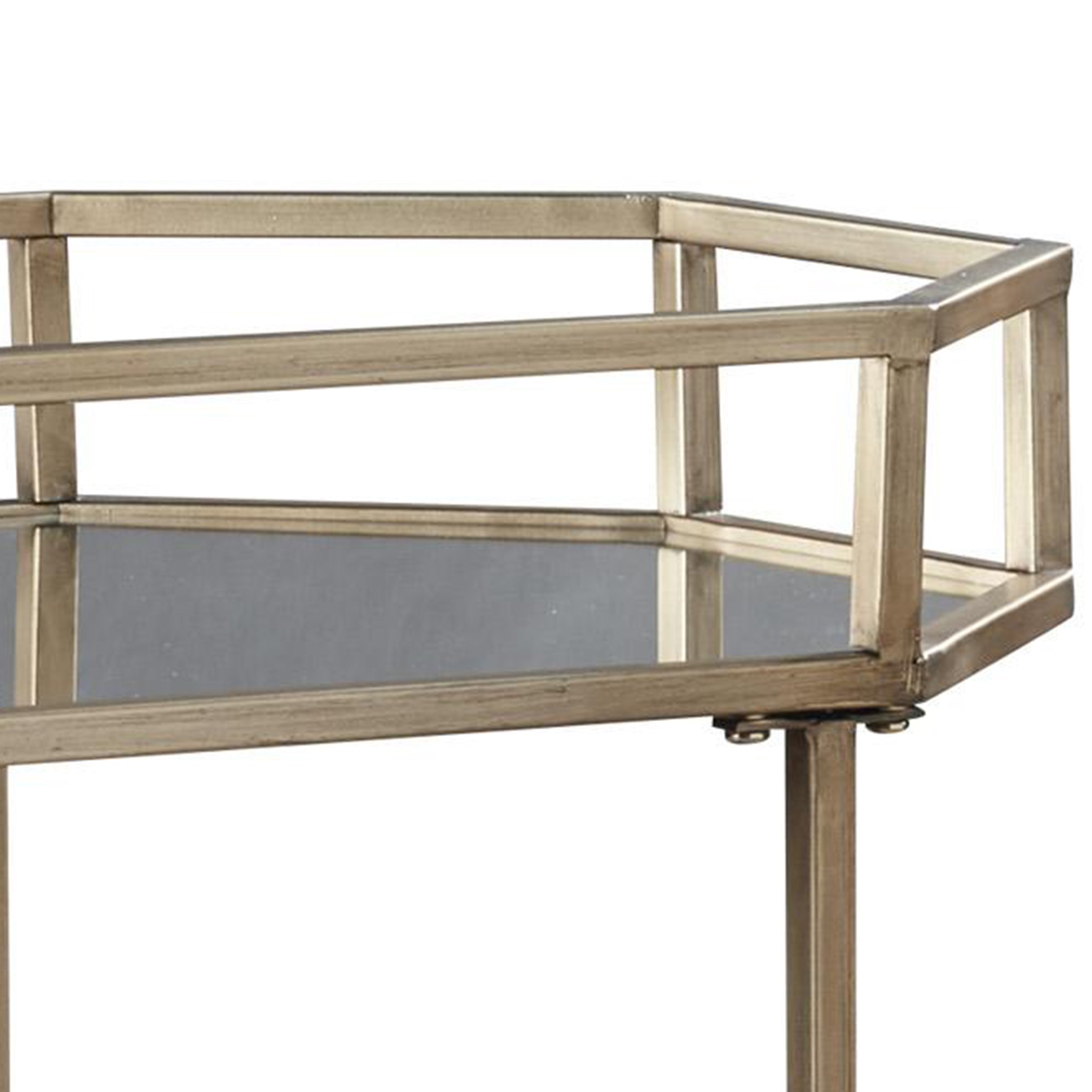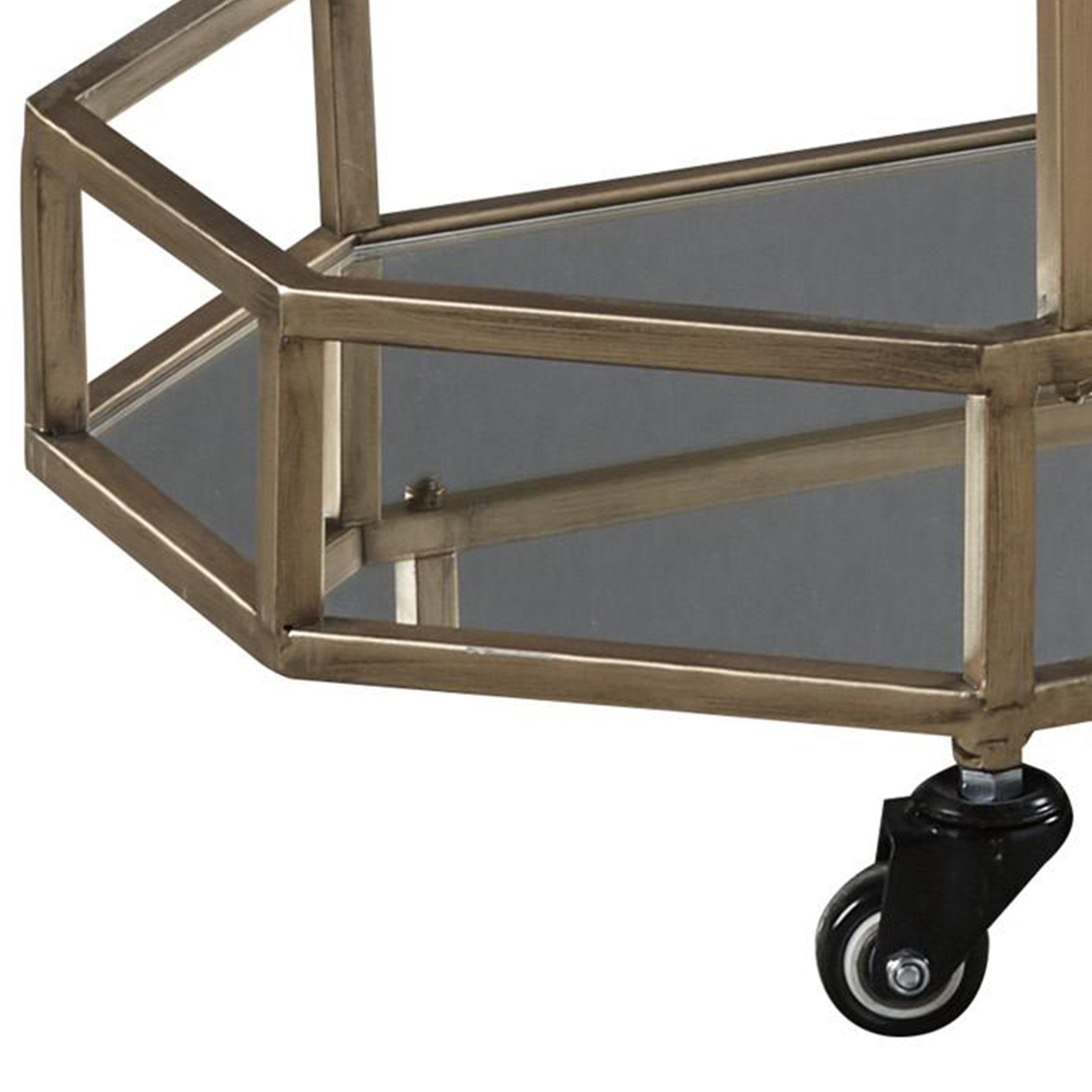 Pamper your guests by serving them in this beautiful industrial style metal based gold tone finish bar cart featuring mirrored tray top and bottom with octagonal frame. Supported on caster for easy mobility, it can be used to keep wine bottles and food, to be served in an organized manner.