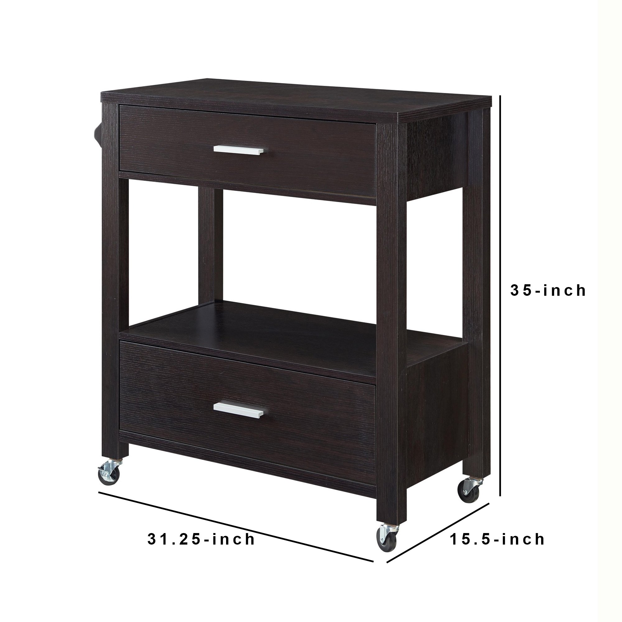 Home > 2 Drawer Wooden Kitchen Cart with Casters and 1 Open Shelf, Dark Brown
