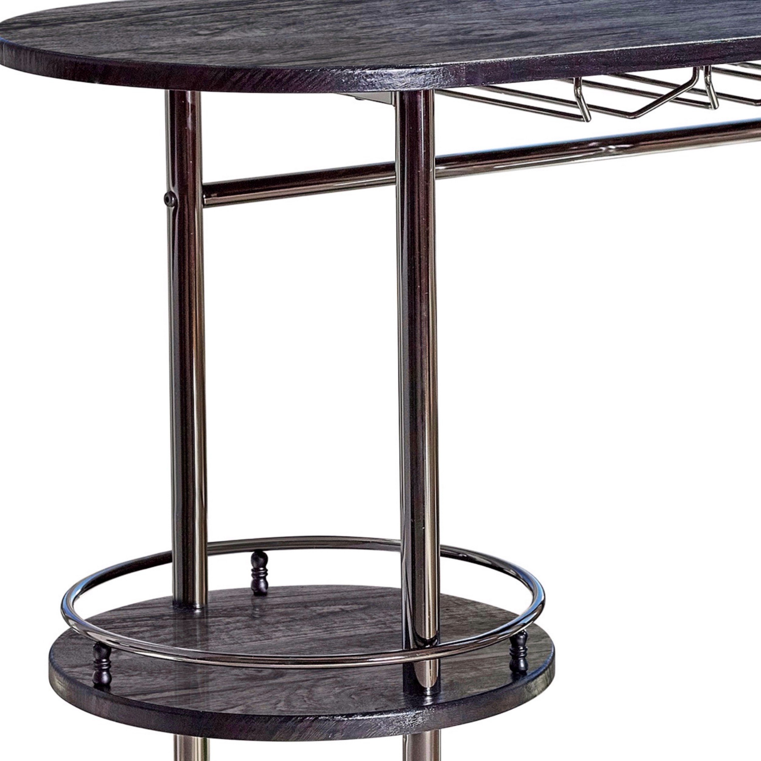 Entertain in a modern space with the inclusion of this utility exceptional bar unit. It features oblong silhouette with wooden top, identical shelves, and chrome finish tubular metal support offer a sophisticated ambiance. This charming, contemporary design bar unit will surely delight your guests and perfect for homes both large and small.
