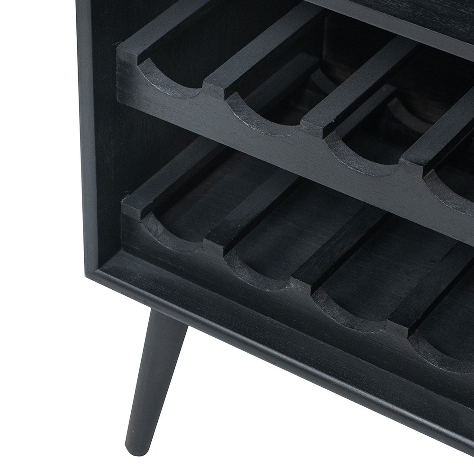 Made from composite and pine wood in a jet black finish for durability and transitional style, this spacious wine cabinet is sure to add both functionality and visual interest to your kitchen or dining area. With two shelves and four compartments, it comes equipped with eleven racks for keeping your wine bottles safe and beautifully on display. Check out our Dana collection for matching items.