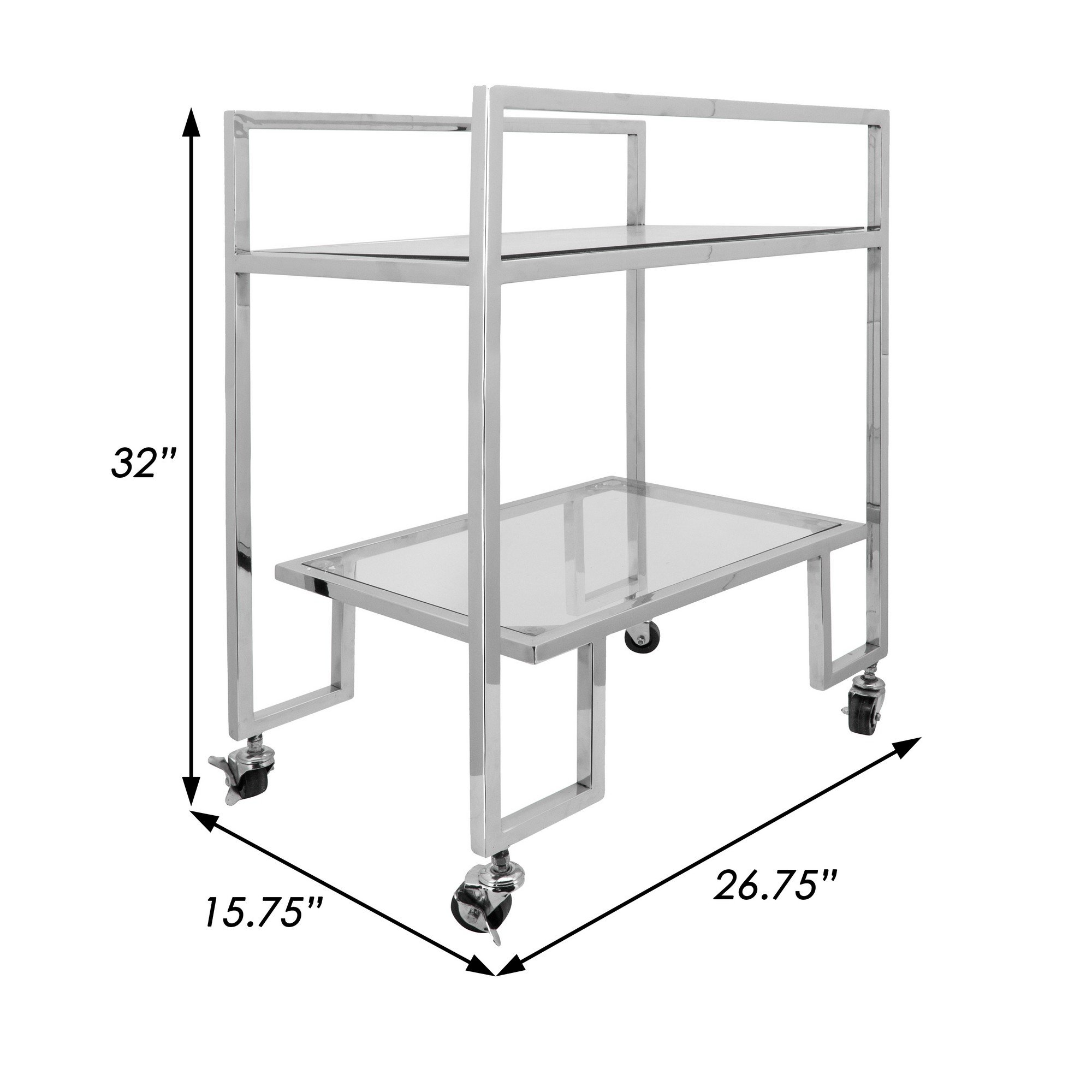 Bring wheels to your meals and drinks with this gorgeous contemporary style rolling kitchen bar cart. Featuring two tiers of clear glass accented shelves, this piece is crafted from a sturdy metal frame in a chrome silver finish. Topped off with conveniently sturdy caster wheels, two of which have brakes to prevent the cart from rolling away unattended.