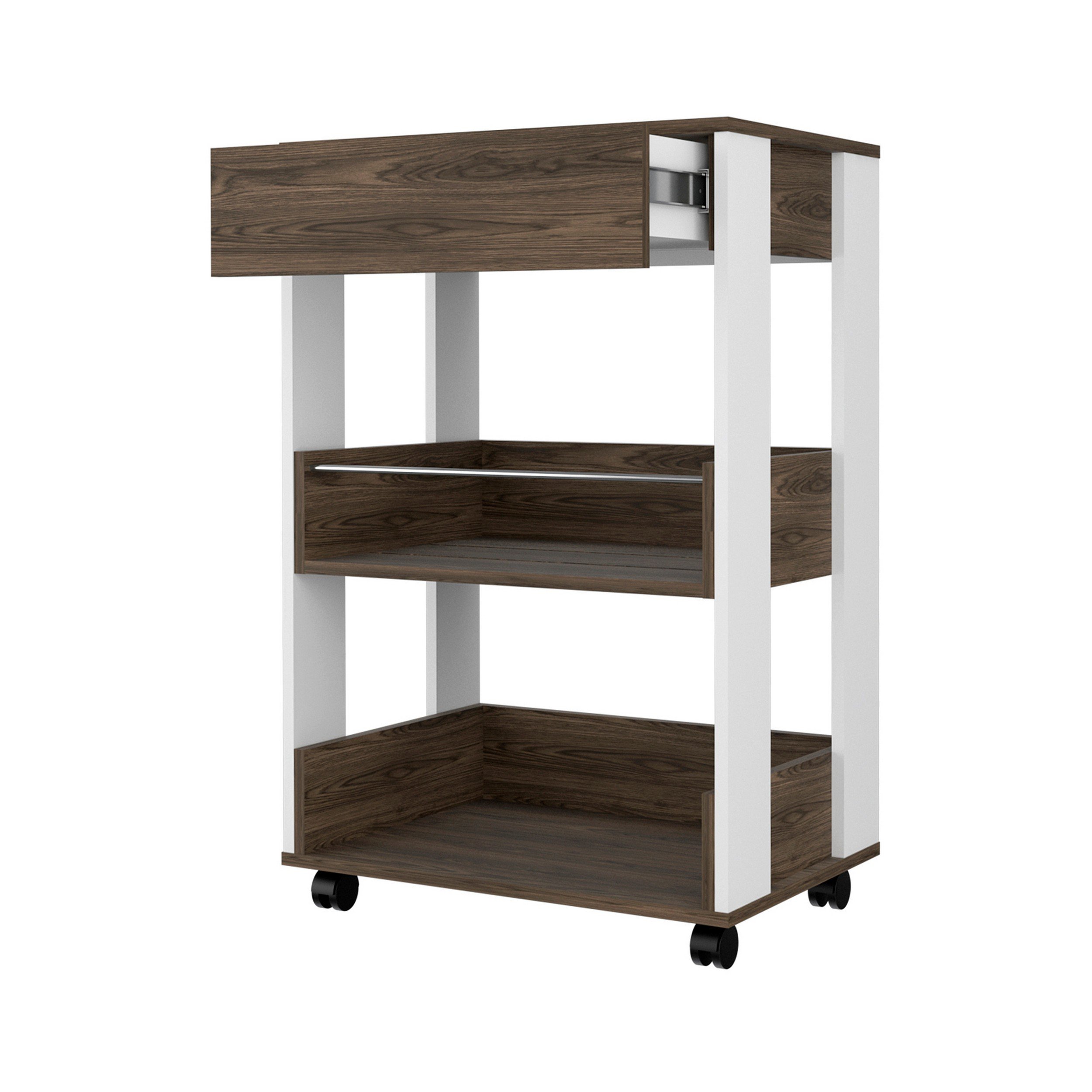 35 Inch Rolling Kitchen Bar Cart, 1 Drawer, Shelves, Grain Details, White
