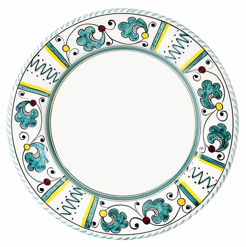 ORVIETO Green, Red, Blue Collections: The Orvieto (or Orvietano) design is a very old and traditional pattern that originated during the Renaissance in the hill-top town of Orvieto Italy. Truly one of Italy's most unique and interesting cities, Orvieto has a charming medieval character, mainly due to its celebrated Cathedral, a gem of Gothic architecture that took more than 100 years to build. The 'Galletto' (Rooster) pattern's main motif is a crowing rooster that symbolizes good wishes for blessings, prosperity and well-being. Hand made in Deruta-Italy. All Deruta of Italy products are lead and cadmium Free. - Dishwasher Safe Not recommended for microwave use. Size: 11" DIAM.