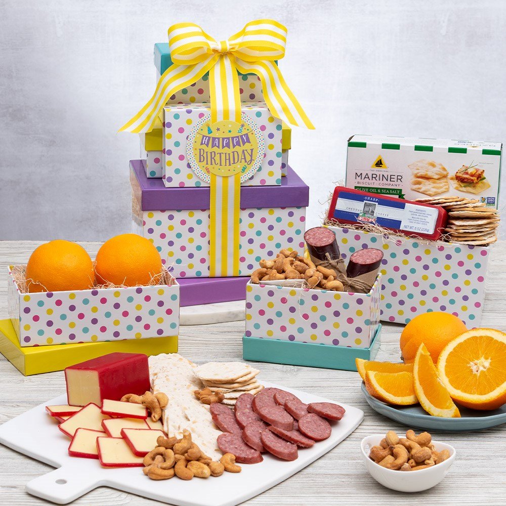 Say “Happy Birthday” with this festive birthday-themed gift tower. Bright and cheery boxes are filled with our favorite birthday celebration treats. To please their sweet tooth, we've artfully arranged gourmet popcorn and fruity candy inside the box tiers. This gift is sure to make their birthday a memorable one!
