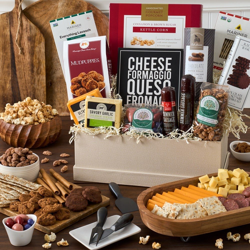 Indulge in the Ultimate Meat and Cheese Gift Basker, the perfect present for any gourmet enthusiast. This beautifully packaged gift features new cheese knives, premium cheese and crackers, savory sausage, crunchy popcorn, decadent cookies, and a delicious chocolate-covered berries mix. Whether you're celebrating a special occasion or want to treat yourself, this gift offers a delightful assortment of high-quality treats that will impress any palate. The Ultimate Meat and Cheese Gift is the ultimate choice for those who appreciate the finer things in life.