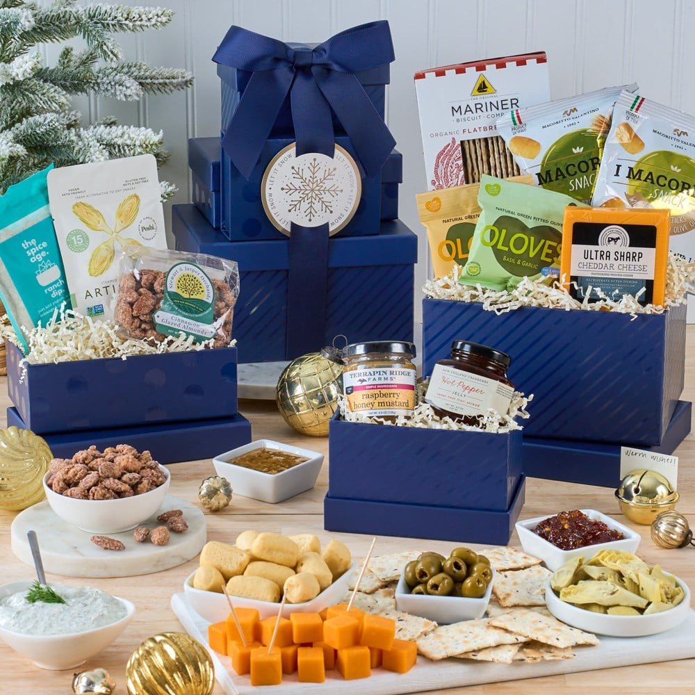 Introducing our Premium Charcuterie Gift Tower - the ultimate charcuterie celebration in a box! Your recipient will discover layers of delicious gourmet charcuterie treats, including crispy artisan crackers, creamy cheese, uniquely delicious flavored olives, the perfect kick from hot pepper jelly, mustard that's a game changer, glazed almonds for a sweet twist, mini breadsticks for a playful touch and marinated artichokes that are incredibly tasty. This delightful and mouth-watering gift tower is ideal for birthdays, anniversaries, holidays, or any day that deserves a flavor-packed fiesta. Celebrate life's special moments by sending a gift tower of gourmet delights.