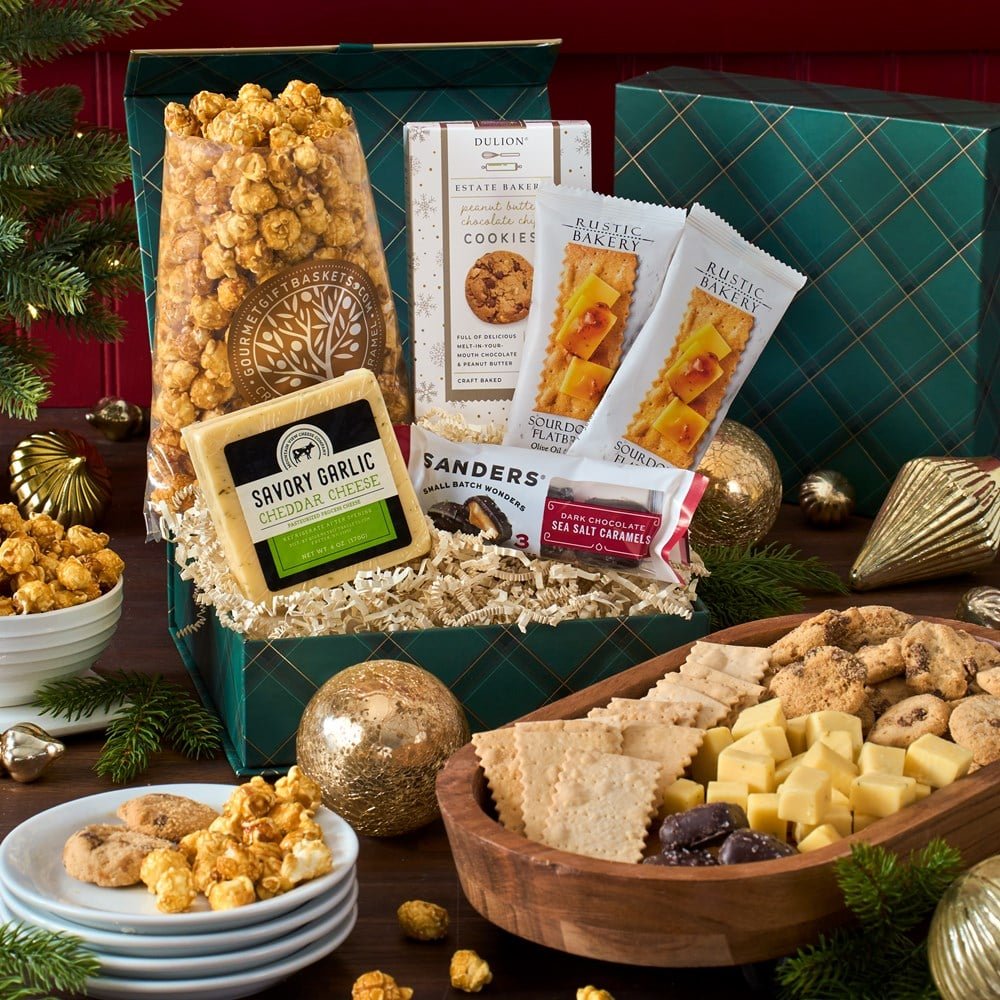 Our Holiday Gift Box is the perfect present to send to friends, family, and colleagues for the holidays! Inside the festive holiday box, your recipient will indulge in our irresistible caramel popcorn, enjoy creamy cheese and crispy crackers, and delight in peanut butter chocolate chip cookies that will leave them reaching for more. Our Holiday Gift Box is perfect for spreading holiday cheer and showing you care!