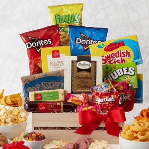 Send a gift full of snacks perfect for their next movie night! This gift basket starts with Signature Beef Summer Sausage, Jalapeño Cheddar Blend, and Golden Toasted Crackers to create savory, snackable bites. Then, there's plenty of popcorn, chips, and candy to share.