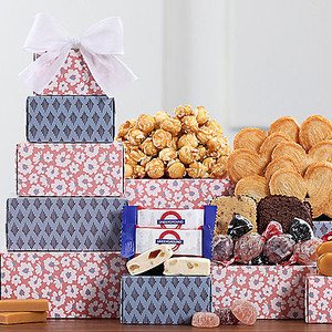 This sweet tower is the perfect way to send your greetings, say thank you or convey countless other well wishes. Decorative boxes are filled with a collection of Le Preziose sugared blackberry and raspberry jellies, nougat peanuts and fruit bites, English classic fudge with sea salt, vanilla caramels, Grona pastries, brownies and caramel popcorn. They will love every item in this distinctive tower.