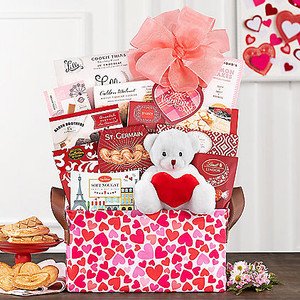 A soft, adorable bear with a gaint heart sits atop this gift basket filled with sweet Valentine goodness. Lindt milk chocolate truffles, Lille chocolate cookie thins, puff pastries, chocolate brownies, walnut cookies, lemon cakes, fruit and nut bites, Truffettes French dark chocolate truffles dusted with cocoa powder, vanilla fudge with sea salt, raspberry and blackberry fruit jelly candy are a fun and easy way to send your Valentine wishes.