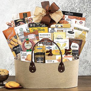 This gracious basket will deliver your encouragement and support. Godiva milk chocolate truffles, cheddar cheese biscuits, Daniele sopressata salami, garlic herb cheese wedges, sea salt olive oil crackers, Ghirardelli milk chocolate with caramel, chocolate coconut macaroons, salted Virginia peanuts, milk chocolate hazelnuts, cranberry sesame cookies, vanilla fudge with sea salt, French butter cookies, Lily O'Brien's sticky toffee and more.