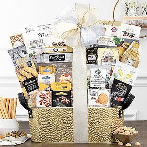 This gourmet gift basket filled with Ghirardelli milk and white chocolate with caramel, vanilla fudge with sea salt, Lille chocolate cookie thins, pretzels, cheddar cheese biscuits, basil thyme artichoke snacks, smoked Gouda cheese spread, Italian milk chocolate, olives, chocolate cream cookies, Ahmad English tea, Lindt and Godiva milk chocolate truffles, French butter cookies, blackberry and raspberry fruit jelly candy, almond cookies and more will express your gratitude and deliver your well wishes.