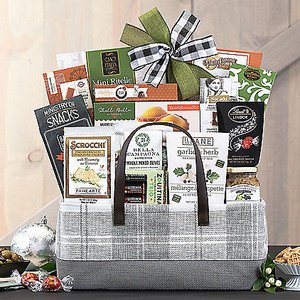 A collection of sweet and savory gourmet favorites are piled high for this handcrafted gift basket. Lindt milk chocolate truffles, sesame cranberry cookies, a trio of olive oils and garlic herb dip mix, bacon habanero snacks, vanilla fudge with sea salt, rosemary crackers, green and black olive tapenade, sesame crackers, olives, tiramisu milk chocolate truffles, Lily O'Brien's sticky toffee, madeleine cakes and Truffettes truffles make The Connoisseur your go-to gift for families, friends and clients.