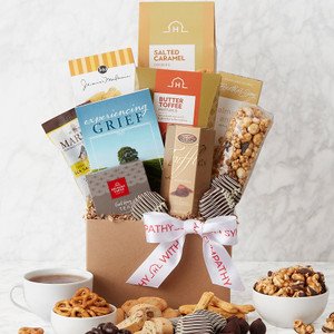 Show your care and compassion with a sympathy candy and treats gift basket filled with comforting favorites. Tucked inside are gouda cheese straws, Butter Toffee Pretzels, Marich Milk Chocolate Sea Salt Cashews, Chocolate Caramel Corn, French Truffles, Chocolate Covered Sandwich Cookies, Salted Caramel Cookies, and Biscotti Di Suzy Almond Anise with Earl Grey tea. The book, Experiencing Grief is a thoughtful touch.