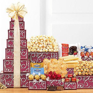 This Chocolate and Sweets gift tower makes it easy to send your best wishes. Ghirardelli milk chocolate with caramel and dark chocolate with caramel and sea salt, Yves Thuries dark chocolate truffles, caramel popcorn, Guylian Temptations Belgian milk chocolate truffles, vanilla wafers, kettle corn, Lindt Lindor milk chocolate truffles, puff pastries, Belvaux traditional Belgian truffles, Italian tiramisu truffles and a chocolate souffle pastry are neatly packed in a tower of beautifully decorated boxes, finished with a hand-tied bow.